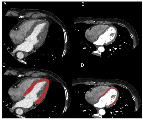 Images and segmentation examples of cardiac CTs of patient with history of hypertension (HTN, (A–C)) and without history of hypertension (NC, (B–D)). On a 4-chamber view, LV was segmented using a polygonal region of interest (ROI). Care was taken in not including blood in LV cavity, epicardial fat or major coronary arteries. Clinical data of HTN patient were: male, 73 years old, BMI = 24.7 kg/m2, history of diabetes, dyslipidemia and hypertension, septum width: 14 mm. Clinical data of NC patient were: female, 61 years old, BMI = 18.9 kg/m2, smoker, familiarity with cardiovascular disease, no history of diabetes, dyslipidemia and hypertension, septum width: 8 mm.