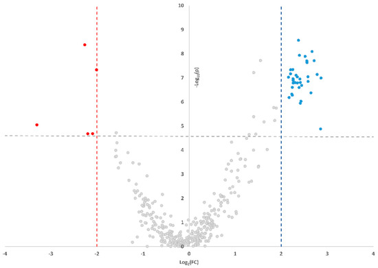 Smile plot reporting the features’ values change between HTN and NC patients. Red dots indicate features reduced in HTN, while blue dots indicate features increased in HTN.
