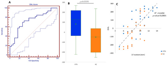 (A) Area under the receiver operating characteristic curve of the EML score (0.731 ± 0.064) (p-value < 0.001; (B) EML-score distribution among the HTN and NC patients; means values resulted 82.0 ± 155.9 and −49.1 ± 152.7, respectively (p-value < 0.001); (C) Correlation among LV septum width (mm) and Ensemble Machine Learning Score (R2 = 0.5292, p-value < 0.0001).