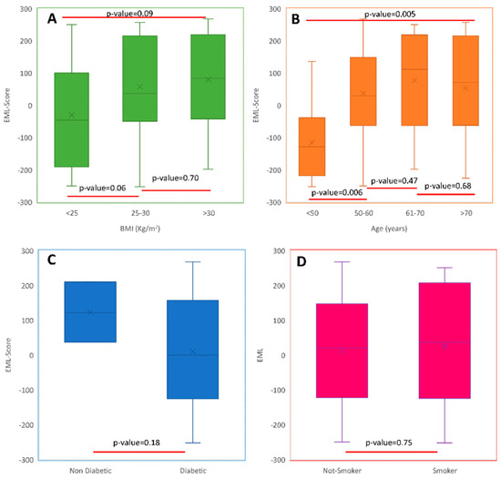 Box and whiskers plot reporting the EML score distribution in (A) normal weight (BMI < 25 kg/m2), overweight (25 < BMI < 30) and obese (BMI > 30 kg/m2) subjects; (B) subjects with <50 years, 51–60, 61–70 and >70 years; (C) in diabetic and non-diabetic subjects; (D) in smoker and not-smoker subjects.