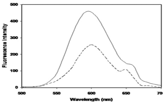 Fluorescence emission spectra of native human DNA (–––) and modified human DNA with 1.515 mM N-OH-AABP (–). The fluorescence scan was performed in triplicate. The plot was created by taking the average of three scans. The modification was statistically significant as compared to the control (p < 0.005). Reprinted with permission from Ref. [12]. Copyright 2013 PLoS ONE.