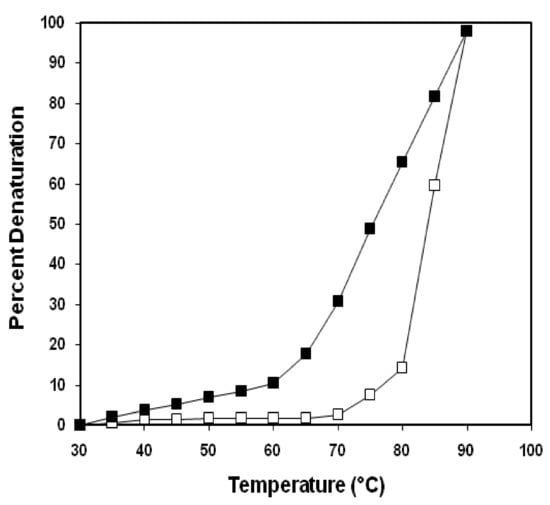 Thermal melting profile of native human DNA (□) and N-OH-AABP-modified human DNA (■). The thermal denaturation experiment was performed in triplicate. The drop in Tm is statistically significant for modified human DNA as compared to the native human DNA.