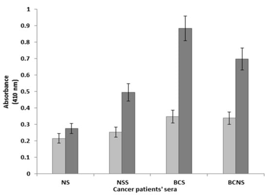 A total of 80 serum tests were examined for auto-antibody recognition. Overall, 40 samples were from the patients with a background marked by smoking, while the other 40 samples came from non-smokers. Sera from age and sex-matched normal healthy people (n = 20) served as a control (Figure 3). In the smoker group of bladder cancer patients, higher binding with N-OH-AABP-modified DNA was seen in all samples. However, for further studies, just those examples were chosen in which the binding with N-OH-AABP-DNA was more than twofold the binding with the native DNA. Of the aggregate of 40 samples from the smoker group, 29 samples (72.5%) indicated higher binding and were chosen for further studies. This rate is enormous, and is likely a biomarker in case of bladder cancer.