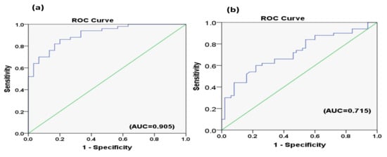 In order to confirm the presence or prevalence of auto-antibodies against N-OH-AABP-modified human DNA as diagnostic marker in the sera of bladder cancer subjects, a receiver operating characteristic (ROC) and area under the curve (AUC) was established. where AUC 0.905 with 85% sensitivity and 80% specificity in the smoker group of bladder cancer patients compared to adjacent controls (Figure 4a) was observed. Moreover, the AUC 0.715 with 68% sensitivity and 62% specificity in non-smokers (Figure 4b) was observed with respect to their adjacent control. The results showed that auto-antibodies against N-OH-AABP-modified human DNA in the smoker group may be used as a diagnostic biomarker, since they have the ability to discriminate bladder cancer patients from their controls.