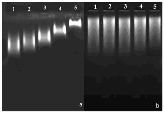 The auto-antibodies from the smoker group indicated more specific binding; they were subsequently utilized for a band shift assay to visually recognize the interaction of native or N-OH-AABP-modified human DNA with the purified IgG from bladder cancer patients. The immune complex of N-OH-AABP DNA with the purified IgG caused a relative increment in the gradual mobility in retardation and gradual increase in the band intensity near the wells in agarose gel electrophoresis. In any case, native DNA did not exhibit any noticeable retardation in mobility, which shows that the immune complex formation under identical conditions did not occur with native DNA [21] (Figure 5a,b). This prompts us to conclude that N-OH-AABP creates neo-epitopes on the DNA macromolecule that are perceived as ‘alien’ or non-self by the immune system, bringing about autoantibody generation in bladder cancer patients.