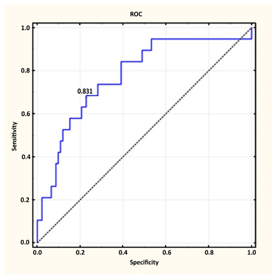 To discern patients without any active lesions suggesting recurrence (group 1) from patients with isolated local recurrence (group 2) based on [68Ga]Ga-PSMA-11 results, the cut-off point was 0.831 ng/mL (specificity: 0.772; sensitivity 0.684; AUC: 0.775 (Figure 1)). In addition, based on the adopted level, α = 0.05 and p < 0.0001, it was found that the detection of recurrence using the PSA level was significantly more encouraging than the random division of patients into two groups: those without changes and those with suspected recurrence in the prostate fossa.