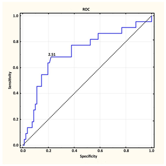 Performing a similar analysis to the discrepancy between groups 3 and 4, the best cut-off point based on [68Ga]Ga-PSMA-11 results was 2.51 ng/mL (specificity 0.780; sensitivity 0.682; AUC 0.72. (Figure 2)). Again, in the analysis performed using the ROC curve based on the adopted level, α = 0.05 and p = 0.0009, it was noted that detecting a local recurrence with PSA level was significantly better than dividing patients with oligometastatic and polymetastatic disease into two random groups.