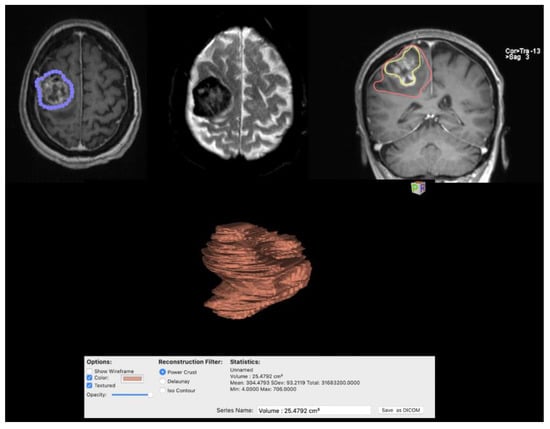 Images show calculation of edema volumes and contrast-capturing lesion with 3D reconstruction of the tumor obtained with Osirix software.