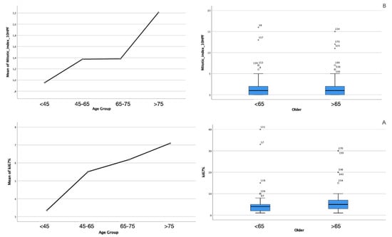 From the histochemical point of view, concerning the WHO classification, the two subgroups did not present statistically significant differences in terms of grading (p > 1, Figure 2), the expression of ki67 (p = 0.847, Figure 3A), or the mitotic index measured on 10 HPF (p = 0.372, Figure 3B), although a progressive increase in these parameters among the age groups was observed.