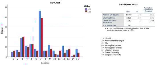 In the final division in the main subgroup A, the number of meningiomas in the young group <65 were 188, and in subgroup B, meningiomas in the elderly totaled 152. All the relevant details with analysis results are included in Table 1.