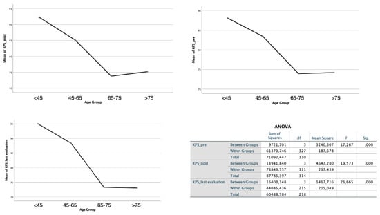 ANOVA study performed on the four age groups shows a significantly lower KPS value in patients over 65 years old. Further, recovery of neurological function and performance grade after the surgical procedure remained consistently lower in the elderly group both in the postoperative phase and in the last evaluation at follow-up (both p < 0.01).