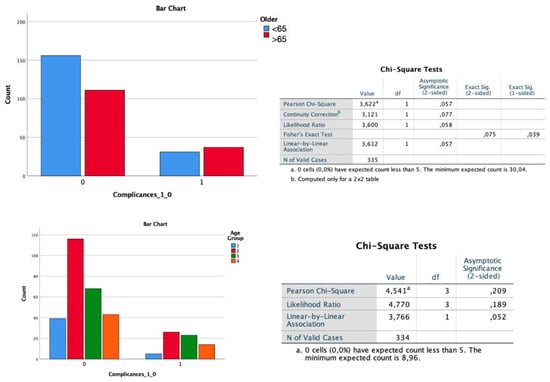 Measuring and considering all early and late complications in their totality during the entire follow-up (p = 0.039 one-sided) and considering the overall mortality (p < 0.01), there are statistically significant differences between patients <65 years and >65 years. Through the ANOVA study, it was found that this difference is maintained even when analyzing complication and mortality rates over the four age subdivisions (p < 0.01), thus showing no differences in the groups between 65–75 and >75 years (Figure 8).
