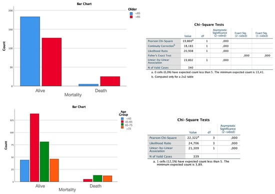 Bar chart of the ANOVA study shows that the difference in mortality at last evaluation is maintained even when analyzing rates over the four age subdivisions (p < 0.01), thus showing no differences in the groups between 65–75 and >75 years.