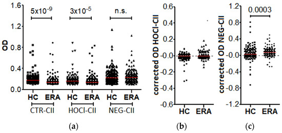 Reactivity against modified CII in patients with early RA (ERA) and healthy controls (HC). (a) Reactivity measured as OD before correction; (b) anti-HOCl-CII; and (c) anti-NEG-CII specific reactivities, obtained after subtracting the OD against the CTR-CII. The red line represents the median OD value in each group. n.s. = non significant.