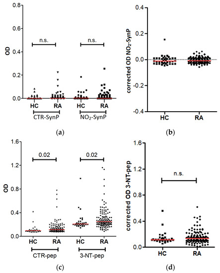 Reactivity against nitrated proteins and peptides in RA patients and healthy controls. (a) Uncorrected; and (b) corrected OD of the reactivity against NO2-SynP; (c) uncorrected; and (d) corrected OD of the reactivity against a 3-NT-pep. The red line represents the median OD value in each group. n.s. = non significant.