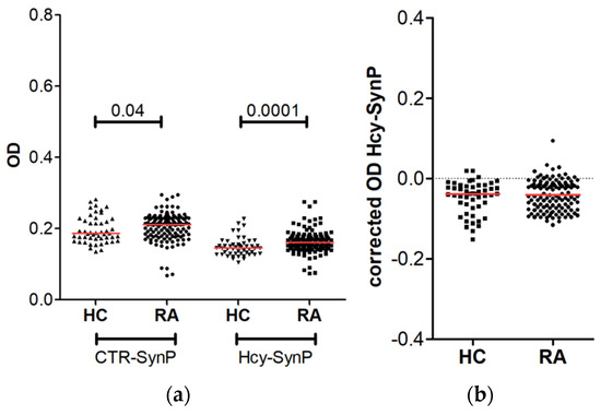 Reactivity against homocysteinylated SynP in RA patients and healthy controls. (a) Reactivity measured as OD before subtracting the OD against CTR-SynP; (b) specific reactivity against Hcy-SynP after correction. The red line represents the median OD value in each group.