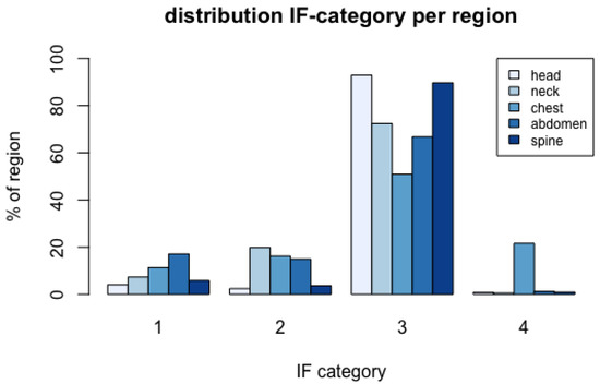 Figure 3 summarises the proportions of IF categories by age group. A detailed summary of numbers and proportions of the severest IFs per region and age group is given in Table S2. Significantly more IFs of any category were found in female than male patients (75.2% vs. 71.5%) (Chi2: 4.73, df: 1, p = 0.03). There was no significant relation between age and sex and the severity of IFs in the head and the abdomen. In the neck region significantly more category 2 IFs were detected in female subjects (26.2% vs. 6.1%), and more category 3 IFs were detected in male subjects (86.1% vs. 65.5%; Chi2: 21.35, df: 3, p < 0.001). In the chest region, significantly more IFs of category 4 were detected in female subjects (22.9% vs. 11.4%; Chi2: 12.09, df: 3, p < 0.05). A detailed summary of numbers and proportions of the severest IFs per region and sex is given in Table S3. Significant relationships between age (Chi2: 22.45, df: 6, p = 0.001) and female sex (Chi2: 9.64, df: 3, p = 0.022) and IFs in the spine regions were measured. More category 3 IFs were detected in the oldest (93.8%) and female subjects (92.0% vs. 82.7%). Table 4 and Table 5 summarise the most frequent IFs per region and the most frequent category 1 and 2 findings per region.