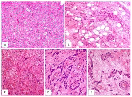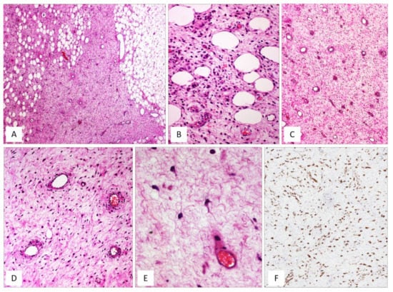 AMFB is a benign, superficially located (subcutaneous) stromal tumour, firstly described by Fletcher et al. in 1992 [27], that mainly involves the vulva and vagina [28,29] of women in the reproductive or, less frequently (10% of cases), in the postmenopausal years [28,29]. The less frequently affected sites include the perineum, inguinal area and fallopian tubes [27]. Tumours with partial overlapping morphology have been reported in the inguinoscrotal region of male patients under the term of “AMFB/AMFB like-tumor” [18] but they are currently best regarded as CAF [29]. Patients typically present with a slowly growing, painless subcutaneous mass/swelling, measuring <5 cm in maximum diameter, frequently misinterpreted as a Bartholin gland cyst. Grossly, AMFB presents as a well-circumscribed, usually unencapsulated lesion, typically measuring <5 cm in its greatest diameter. Rarely, AMFB may present as a large pedunculated mass [30,31]. Histologically, as its name suggests, the two main striking features of AMFB are a population of cells with a fibroblastic/myofibroblastic profile and a well-represented vascular component. Histologically, AMFB is a well-circumscribed, unencapsulated or partially/totally encapsulated tumour showing alternating hypocellular and hypercellular areas [32,33,34,35] (Table 5); it is composed of a proliferation of bland-looking spindled-to-epithelioid cells, arranged singly or in small nests or cords (Figure 6A–D) that tend to be clustered around blood vessels (Figure 6B,E). The epithelioid/plasmacytoid morphology is best appreciated in the hypercellular areas; a predominant spindle-cell morphology is more frequently observed in postmenopausal patients. The neoplastic cells, usually plump and with appreciable eosinophilic cytoplasm (better in cells with epithelioid morphology) and ovoid-to-spindle-shaped nuclei, are set in a variably myxoedematous-to-fibrous stroma (Figure 6B,C). Scattered mast cells and lymphocytes can be sparsely observed in the stroma. Mitotes are rare or absent. The vascular component is usually represented by thin-walled, capillary-like vessels (Figure 6A), but thick-walled, often hyalinized vessels, can be encountered. The presence of mature, fatty tissue, regarded as an integral part of the tumour and not merely entrapped peripheral adipose tissue, is a common feature, and, for when it represents at least 50% of the entire tumour, the term “lipomatous AMFB” has been proposed [36,37,38,39] (Figure 7A,B). Morphological variations on this common morphological theme have also been reported in AMFB (Table 6). Rarely, AMFB may contain atypical cells and high mitotic activity (so-called “malignant AMFB”) or, frankly, sarcomatous areas closely resembling leiomyosarcoma or undifferentiated pleomorphic sarcoma (so-called “dedifferentiated AMFB”) [40,41]. By means of immunohistochemistry, AMFB usually exhibits immunoreactivity for oestrogen receptors (Figure 7C), combined with a variable fibroblastic/myofibroblastic profile with the variable expression of desmin (Figure 7D) and α-smooth-muscle actin (up to 40% of cases) [5,42]. Although bcl-2, CD99, PR and AR are usually expressed in most cases, CD34 is detected, though only in a minority of cases [42]. Molecular studies have failed to detect HMGA1 and HMGA2 rearrangements [14] and the 13q14 deletion [36], the latter being a common finding in both CAF and MFB. In the sarcomatous component described by Nielsen et al. [40], the neoplastic cells are shown negative for desmin, SMA and CD34. Recently, the immunohistochemical strong expression of CYP2E1, as a surrogate marker of a novel genetic alteration, namely MTG1–CYP2E1 fusion, has been reported in AMFB [5]. AMFB is a benign tumour with occasional local recurrences, especially for those tumours not completely resected. Nevertheless, the recurrences are not destructive and, thus, easy to remove. Actually, AMFB should be considered a tumour with a very low risk of sarcomatous overgrowth/dedifferentiation. Only a single case of AMFB exhibiting sarcomatous dedifferentiation has locally recurred as a purely sarcomatous tumour [40]. Distant metastases have never been reported for either “malignant or dedifferentiated AMFBs”.