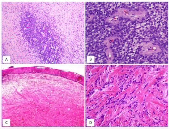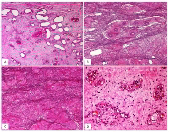 - McCluggage, W.G.; Ganesan, R.; Hirschowitz, L.; Rollason, T.P. Cellular angiofibroma and related fibromatous lesions of the vulva: Report of a series of cases with a morphological spectrum wider than previously described. Histopathology 2004, 45, 360–368. [Google Scholar] [CrossRef]