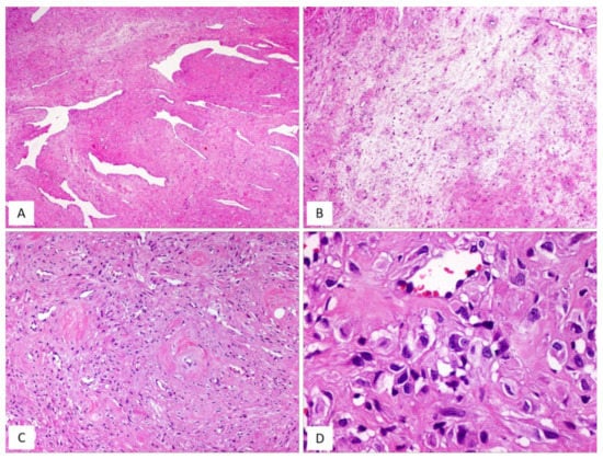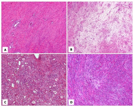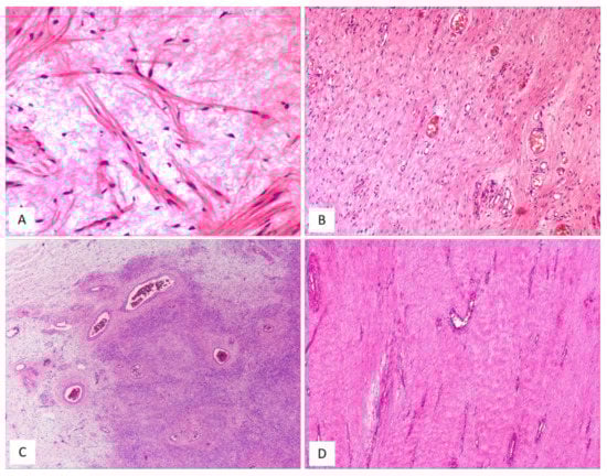 The category of the “stromal tumours of the lower female genital tract” covers a wide spectrum of lesions with variable morphological and immunohistochemical heterogeneity. They arise from the specialized, hormonally responsive stroma of the lower female genital tract, and, based on morphological and immunohistochemical features, at least four tumour entities can be nosologically recognized: (i) deep (aggressive) angiomyxoma (DAM); (ii) cellular angiofibroma (CAF); (iii) angiomyofibroblastoma (AMFB) and (iv) myofibroblastoma (MFB) [1,2]. Among these tumours, it is crucial to distinguish DAM from the others due to its relatively high risk of local recurrence. Differential diagnosis between these entities is usually straightforward if the typical morphology and clinicopathologic features are encountered. However, some tumours may share several morphological and immunohistochemical features, along with unusual morphologies, raising serious differential diagnostic problems. As MFB, CAF and AMFB may also share chromosomal aberrations, namely a 13q14 deletion (MFB and CAF) or MTG1–CYP2E1 fusion transcripts (AMFB and MFB), it is likely that they are histogenetically related, as previously suggested [3,4,5]. Notably, a recent article emphasized the possibility that CAF may occur with other mesenchymal tumours showing the same 13q14 deletion, such as spindle-cell lipoma and mammary-type MFB [6].