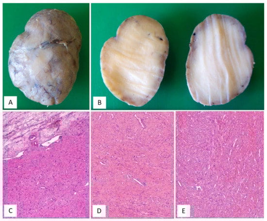 CAF, classic type. (A) Gross appearance: oval-shaped mass with well-circumscribed margins; (B) the cut surface showing a solid mass, whitish in colour. (C) Fibrous tumour with pushing borders (H and E, original magnification 50×). (D) Spindle-shaped cells set in a fibrous stroma (H and E, original magnification 50×). (E) Tumour area with focal fascicular arrangement (H and E, original magnification 50×).
