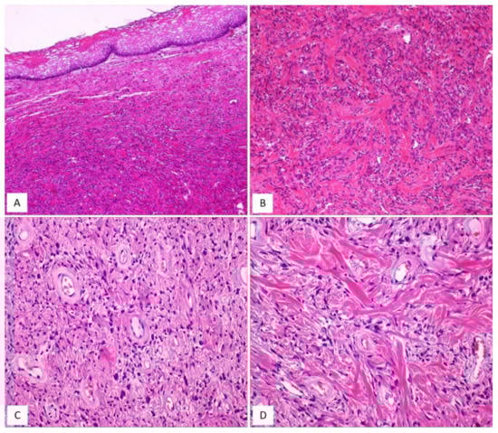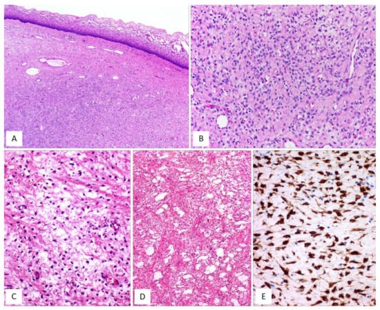 MFB of the lower female genital tract is a benign neoplasm composed of spindled cells with myofibroblastic profile, that arises from the subepithelial stroma of the vagina and, less frequently, of the vulva and cervix (Table 7) [48,49,50,51,52,53,54]. MFB presents as a slowly growing, painless mass affecting mainly adults in their fifth or sixth decade of life. Grossly, tumours present as a well-circumscribed lesion of variable size (2–65 mm), showing a polypoid or nodular appearance. Histologically, MFB is a tumour centred in the subepithelial connective tissue, separated by the overlying epithelium by a thick band of native connective tissue (so-called “Grenz zone”) (Figure 8A). Two distinct subtypes of MFB can be recognized: (i) superficial MFB; (ii) mammary-type MFB. Superficial MFB is characterized by a proliferation of bland-looking, spindle-shaped or stellate cells set in a variably loose, oedematous-to-finely-collagenous stroma, often with reticular, lace-like or sieve-like changes [48,49,50,51,52,53,54] (Figure 8B–E). Tumours may exhibit a variable, moderate-to-high cellularity. The cells have a scant amount of pale-to-eosinophilic cytoplasm and oval-to-elongated-to-wavy nuclei with a small nucleolus; only rarely, mild nuclear atypia can be seen [48]. Mitotic activity is usually low (0–2 mitoses/10 high-power field). The vascular component is relatively inconspicuous and represented by small-sized blood vessels with hyalinized walls [51]. Mast cells are variably interspersed among neoplastic cells. Unlike superficial MFB, mammary-type MFB is composed of spindle-shaped cells, usually arranged in short fascicles with intervening keloid-like collagen fibres [51,52,53] (Figure 9A–D). The blood vessels often show hyalinization of their walls (Figure 9C). Immunohistochemical studies have shown that both superficial and mammary-type MFB are typically desmin+/α-SMA-myofibroblastic tumours [48,49,50,51,52,53,54] (Figure 8E). Apart from desmin, positive staining for CD99, CD34, Bcl-2, ER and PR can be detected in most cases [51]. In addition, about 90% of cases shows a loss of nuclear RB1 expression and the 13q14 deletion by F.I.S.H., confirming that MFB is pathogenetically related to other benign mesenchymal tumours showing a loss of 13q14, including spindle-cell lipoma and CAF [3]. As recently reported for AMFB, MFB also shows an overexpression of CY2E1 as a surrogate of MTG1–CYP2E1 fusion transcripts [5]. The clinical course is benign if a complete surgical excision is achieved. Only a single patient has been reported in the literature to experience a local recurrence (after 9 years) from surgical excision [50]; however, metastatic disease has never been reported.