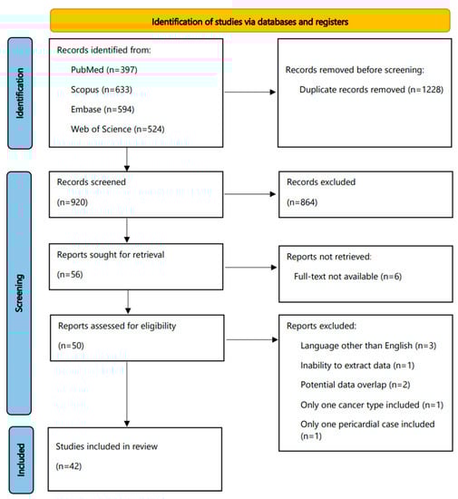 The flowchart of our study is displayed in Figure 1. The search yielded initially a total number of 2148 articles (PubMed, 397; Scopus, 633; Embase, 594; Web of Science, 524); of them, 1228 were removed as duplicates. Then, 920 reports were screened in a title–abstract fashion. The whole process resulted in 42 studies included in our review for subsequent data extraction and analysis.