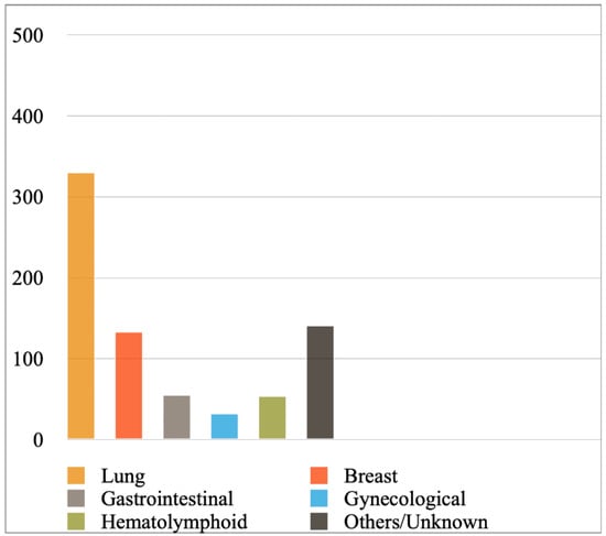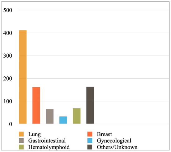 Figure 2 shows the most prevalent cancer primaries in MPEs diagnosed with cytology or a combination of cytology and biopsy in the included studies, while Figure 3 shows their prevalence when results were reported exclusively with cytology. Lung cancer (comprising mainly adenocarcinomas) was reported to be the most common primary, followed by breast cancer, hematolymphoid and gastrointestinal malignancies. Briefly, from the studies reporting findings derived either from cytology or a combination of cytology and biopsy (Figure 2), we calculated the following frequencies: lung cancer 45%, breast cancer 18%, hematolymphoid neoplasms 8%, gastrointestinal cancers 7%, gynecological cancers 4%, and others/unknown 18%. In this analysis, the study by Wilkes et al. [46] was excluded, as it did not report separately the numbers of gastrointestinal and gynecological cancer diagnoses. In addition, from the studies reporting only cytologic findings (Figure 3), we calculated the following frequencies: lung cancer 44%, breast cancer 18%, hematolymphoid neoplasms 7%, gastrointestinal cancers 7%, gynecological cancers 4%, and others/unknown 19%. Analytical results of the reported cancer types in each eligible study are shown in Tables S4 and S5, respectively. Concerning lung cancer, non-small cell lung carcinoma (NSCLC) was much more common than small cell lung carcinoma (SCLC); in the MPEs diagnosed with cytology only, just 13 cases were confirmed as SCLC (out of 330 lung cancer cases in total; Table S5).