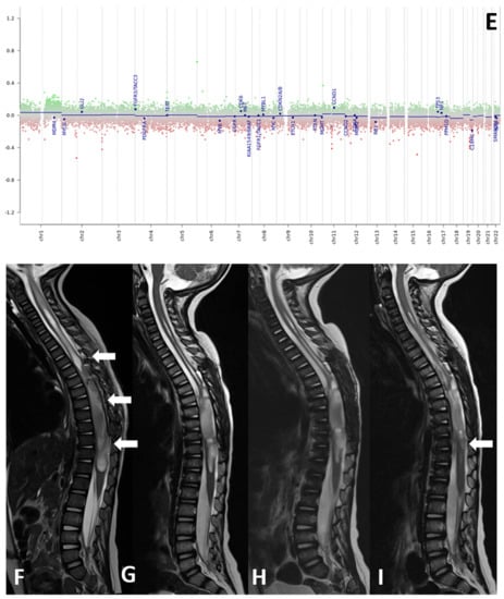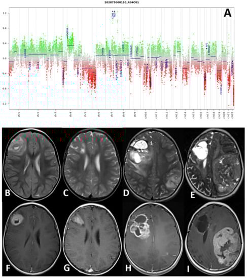 (A–I) Molecular profile (A) and MRI at four consecutive time-points of patient number 4. DNA methylation profile showed a complex copy number variation (CNV) with CDK6 and MET amplification, and a platelet-derived growth factor A (PDGFRA) gain (A). Axial TSE T2-weighted (upper row) and post-gadolinium SE T1-weighted (lower row) sequences at four consecutive time points: at presentation (B,F), at first local recurrence after surgery (C,G), at second local recurrence after reoperation (D,H), and spreading to the contralateral hemisphere (E,I). The right frontal high-grade glioma and recurrences present with a non-homogeneous hyperintense signal on T2-weighted and intense and non-homogenous contrast enhancement on T1-weighted images.