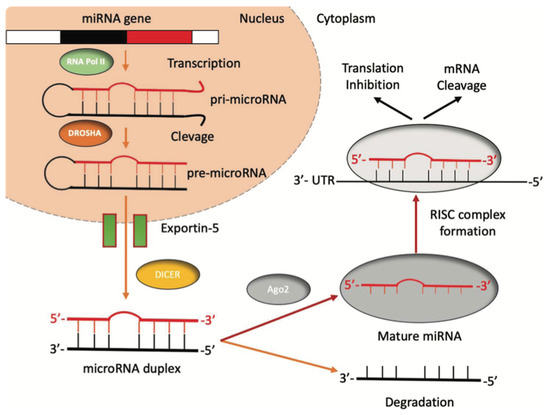 The biogenesis of miRNAs. miRNAs’ genes are transcribed by RNA polymerase II into a pri-miRNA containing one to six miRNA precursors. The double-strand RNA structure is recognized by a nuclear protein called Pasha (DGCR8), which binds the enzyme Drosha to release the pre-microRNA. Pre-miRNAs are exported from the nucleus to the cytoplasm using the shuttle of Exportin-5. Once in the cytoplasm, the pre-miRNA is cleaved by the RNase III Dicer, which interacts with the 3′-end and cuts the loop joining the 3′- and 5′-arms, producing a yet-not-final miRNA duplex (about 22 nucleotides in length). One strand of the mature miRNA is usually degraded, whereas one strand will become a mature miRNA bound to an RNA-mediated silencing complex (RISC). In this complex, the mature miRNA targets the 3′-UTR region of its target mRNA to regulate its translation.