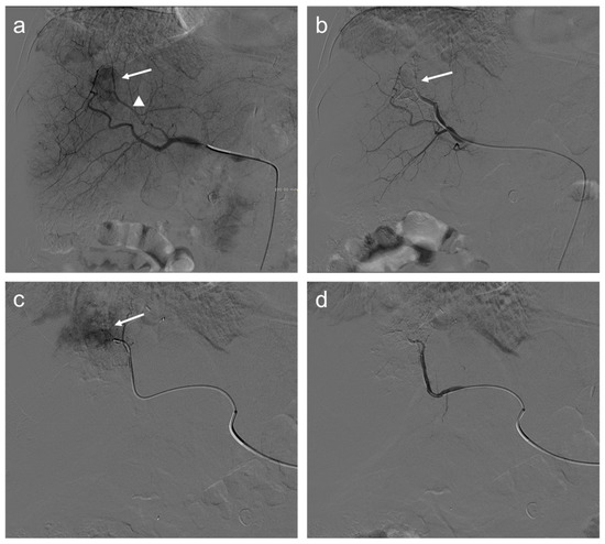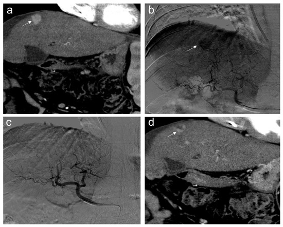 Nevertheless, several studies demonstrated that an increase in locoregional hepatic toxicity was associated with DEB-TACE compared to cTACE. Global hepatic damages, intrahepatic biloma, and biliary injuries were more often described after DEB-TACE in patients with a higher prothrombin time (PT) value, suggesting that cTACE might be more suitable in patients with localized tumors and less advanced cirrhosis. Meanwhile, in patients with advanced age, poor liver function, or large and/or bilobar tumors, DEB-TACE appears to be more favorable. However, this added toxicity of DEB-TACE did not translate into a reduction of treatment efficacy, as both techniques demonstrated similar tumor responses [39]. Indeed, in the last years, several randomized controlled trials (RCTs) were conducted in Europe, showing no significant differences between cTACE and DEB-TACE in terms of local tumor control and/or survival [40,41,42]. Among these trials, the Precision Italia Study Group ended because no significant differences were observed in tumor response and the median time-to-progression was nine months in both arms [42]. Nevertheless, supplementary analyses of Precision V multicenter RCT demonstrated that in 67% of patients with more advanced disease, the incidences of an objective response and disease control were significantly higher in the DEB-TACE than c-TACE group (p = 0.038 and p = 0.026, respectively) [40]. Figure 2 shows an example of the TACE procedure, as performed in our institution.