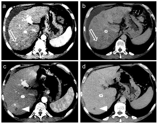 Hepatocellular carcinoma treated with transarterial chemoembolization (TACE) with a complete response: pre-treatment contrast-enhanced CT (a,b) shows a 12 mm nodule (arrow) in segment 7 with arterial enhancement (a) and late wash-out (b). After TACE (c,d), no residual enhancement is seen in the arterial phase (arrowhead in (c)) and there is no wash-out in the late phase (arrowhead in (d)). A geographic region of altered enhancement surrounding the treated lesion in the arterial phase (*) is considered normal.