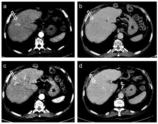 Hepatocellular carcinoma treated with transarterial chemoembolization (TACE) with partial response. Pre-treatment contrast-enhanced CT (a,b) shows a 24 mm nodule (arrow) in segment 8 with arterial hyper-enhancement (a) and late wash-out (b). After TACE (c,d), the presence of nodular hyper-enhancement in the arterial phase (arrow in (c)) with wash-out in the late phase (arrow in (d)) demonstrate the residual viable tumor consistent with a partial response to treatment.