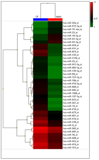 Heatmap with the pseudo-color scale underneath the differentially expressed miRNAs. Log2-transformed microarray signal is considered in the comparison between complete responder (CR; blue bar), partial responder, and progressive diseases (PRPD; red bar) patients. Unsupervised hierarchical clustering was used to order miRNAs. The sample tree with optimized leaf-ordering was drawn using Euclidean distances and average linkages for cluster-to-cluster distance. CR = complete responder and PRPD = partial responder and progressive diseases.