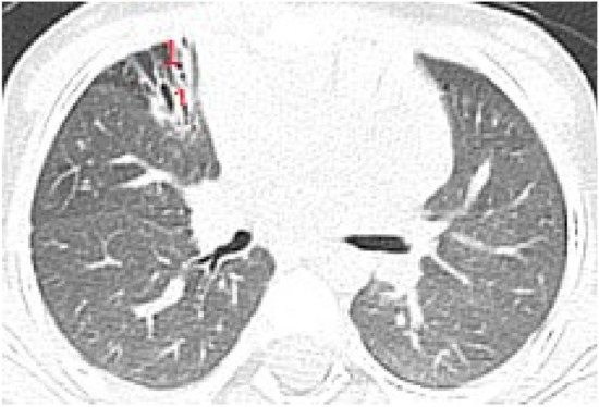 The CT images were analyzed and scored using a modified Bhalla cystic fibrosis score for HRCT [35]. For evaluating the lung lesions, the score considered the quantification of the injuries to the respiratory tract: type (cylindrical, varicose, and saccular) and extension of bronchiectasis, the thickening of the bronchial walls in different stages (mild, moderate, and severe) and the extent of mucus plugging. The quantification of air-trapping zones and the extension of the lung parenchymal lesions (a consolidation area with air bronchogram, consolidation zones, and atelectasis) were also examined.