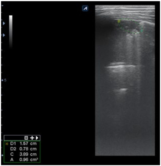 LUS: subpleural consolidation of 1.75 cm/0.78 cm, surface of 0.96 cm2 (score 4), without bronchogram, with adjacent B lines (2 points); A lines also present, examination of left posterior hemithorax.