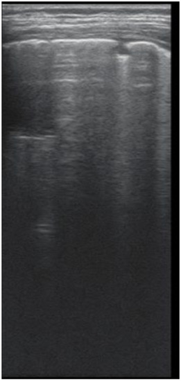 The right hemithorax of the same patients revealed the presence of B lines for cylindrical bronchiectasis via LUS (Figure 5).