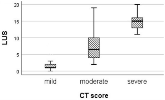 We divided the patients according to their CT score: mild disease (0–33), moderate disease (34–66), and severe disease (> 67) (Figure 6). The correlation in patients with mild disease, expressed by an LUS-CF score from 0 to 7, was weak (rs = 0.439) (p = 0.014), while in patients with moderate disease, the correlation coefficient strongly increased to rs = 0.57, with good statistical significance (p = 0.01). By applying the Kruskal–Wallis test, we found a statistical difference between the median LUS values in the categories of the CT score (H = 39.845, p = 0.000; Table 2).
