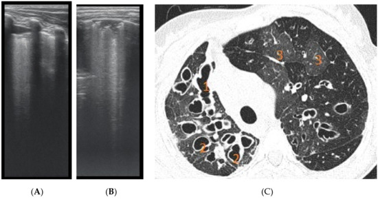 (A) LUS: coalescent B lines, erased A profile, loss of aeration, left hemithorax. (B) LUS image with subpleural consolidations, coalescent B lines, and left hemithorax. (C) CT scan of the same patients: (1) varicose bronchiectasis with middle 1/3 of lung extended and moderate bronchial wall thickening; (2) saccular bronchiectasis with mild and moderate wall thickening; and (3) zones with increased attenuation of pulmonary parenchyma (alveolar infiltrates).