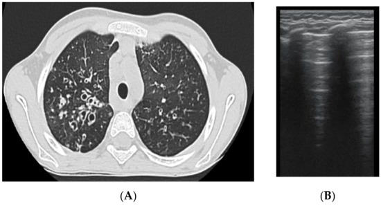 An additional important issue is related to the lack of specificity of B lines, which can quantify a number of diseases [44], ranging from interstitial lung disease or bronchiolitis to acute respiratory distress syndrome or bronchiectasis [45]. We specifically quantified different extensions of bronchiectasis (i.e., cylindrical, varicose, cystic) by the presence of B lines to increase the accuracy of our study, and we eliminated the patients in exacerbations in order to decrease the misinterpretations of interstitial inflammation that can occur in exacerbations with bronchiectasis. As bronchiectasis is the hallmark of CF lung disease, special attention was given to its detection via LUS, and we found LUS to be reliable for the detection of bronchiectasis—a finding that is similar to those of recent studies in adult pathology [46]. The presence of more than three individual B lines per intercostal space, in longitudinal sections, detected before CT examination, suggested certain structural changes. In some of the patients, the above-mentioned studies quantified bronchiectasis to different degrees; in others, bronchial wall thickening or small mucus plugging—specific features identified on CT; therefore, they are not specific to a single lesion, but their presence definitely indicates a lung lesion.