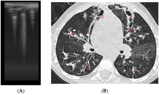 (A) LUS: coalescent B lines, loss of A lines. (B) CT image: (1) cylindrical bronchiectasis with moderate wall thickening; (2) varicose bronchiectasis; (3) saccular bronchiectasis with moderate wall thickening; and (4) several bronchiectasis with mucus plugging.