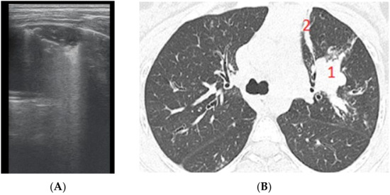 (A) LUS image of atelectasis, consolidation without bronchogram. (B) CT exam illustrates (1) a peribronchovascular consolidation without air bronchogram, and (2) a lamellar (band) atelectasis.