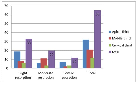 Relationship between severity and vertical location of root resorption.