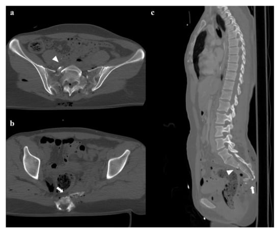 Fractures of the sacrum with involvement of the central canal. Fracture through S2, with anterior angulation of the superior fragment and without dislocation (arrowheads in (a,c)). Fracture of S4 with complete anterolisthesis of the fragments (arrows in (b,c)). There are also some bubbles of air in the adjacent soft tissues.