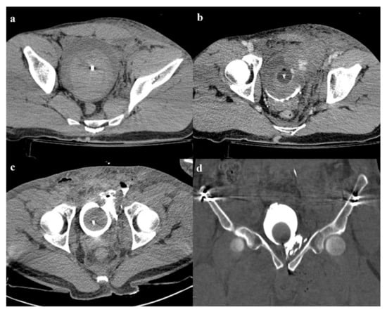 - Quagliano, P.V.; Delair, S.M.; Malhotra, A.K. Diagnosis of blunt bladder injury: A prospective comparative study of computed tomography cystography and conventional retrograde cystography. J. Trauma 2006, 61, 410–421. [Google Scholar] [CrossRef]