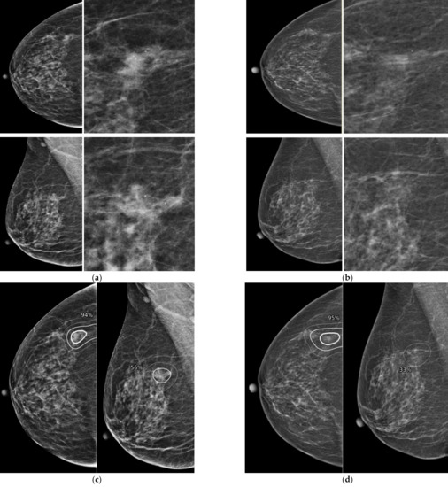 - Birdwell, R.L.; Ikeda, D.M.; O’Shaughnessy, K.F.; Sickles, E.A. Mammographic characteristics of 115 missed cancers later detected with screening mammography and the potential utility of computer-aided detection. Radiology 2001, 219, 192–202. [Google Scholar] [CrossRef]