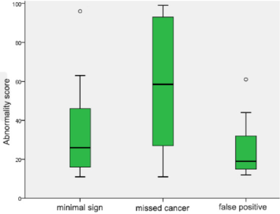 Comparison of abnormality scores in prior mammograms. Box and whiskers plot showing the distribution of abnormality scores of minimal signs, missed cancer and false positive cases. All box plots proved the median value (solid line), interquartile range (green box), 95% confidence interval (black whiskers) and outliers beyond the 95% confidence interval (blank circles).