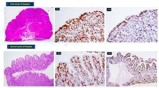 - Brown, I.; Mino-Kenudson, M.; Deshpande, V.; Lawers, G.Y. Intraepithelial lymphocytosis in architecturally preserved proximal small intestinal mucosa: An increasing diagnostic problem with a wide differential diagnosis. Arch. Pathol. Lab. Med. 2006, 130, 1020–1025. [Google Scholar] [CrossRef]