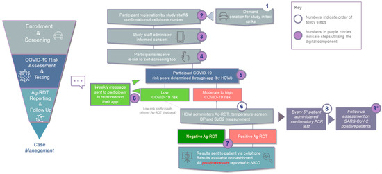 Results from the Ag-RDTs were captured in the digital tool and then sent directly to the participant’s phones via WhatsApp and SMS. PCR results positive for SARS-CoV-2 or discordant with the Ag-RDT result were sent via SMS to the participant’s phone. Participants with positive results were counselled and followed up for 14 days to understand isolation, contacts, disease severity (graded on a Likert scale), and resolution of infection or hospitalization. Participants with negative results were followed up via message to prompt them to complete the screening questionnaire weekly on their own devices.