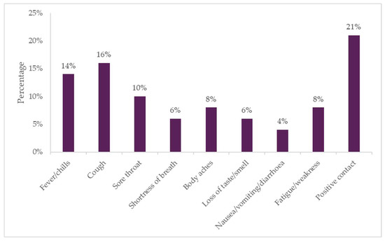Of the 15,443 participants screened as part of the study, most were classified having a low risk of COVID-19. Overall, 19% (n = 2987) participants who underwent screening were classified as “high risk” (2 or more risk factors); 13% (n = 2061) screened were classified as “moderate risk” (at least 1 risk factor), while 67% (n = 10,395) were “low risk” (no risk factors). Figure 2 shows the percentage of participants reporting COVID-19 risk factors (as per screening checklist).